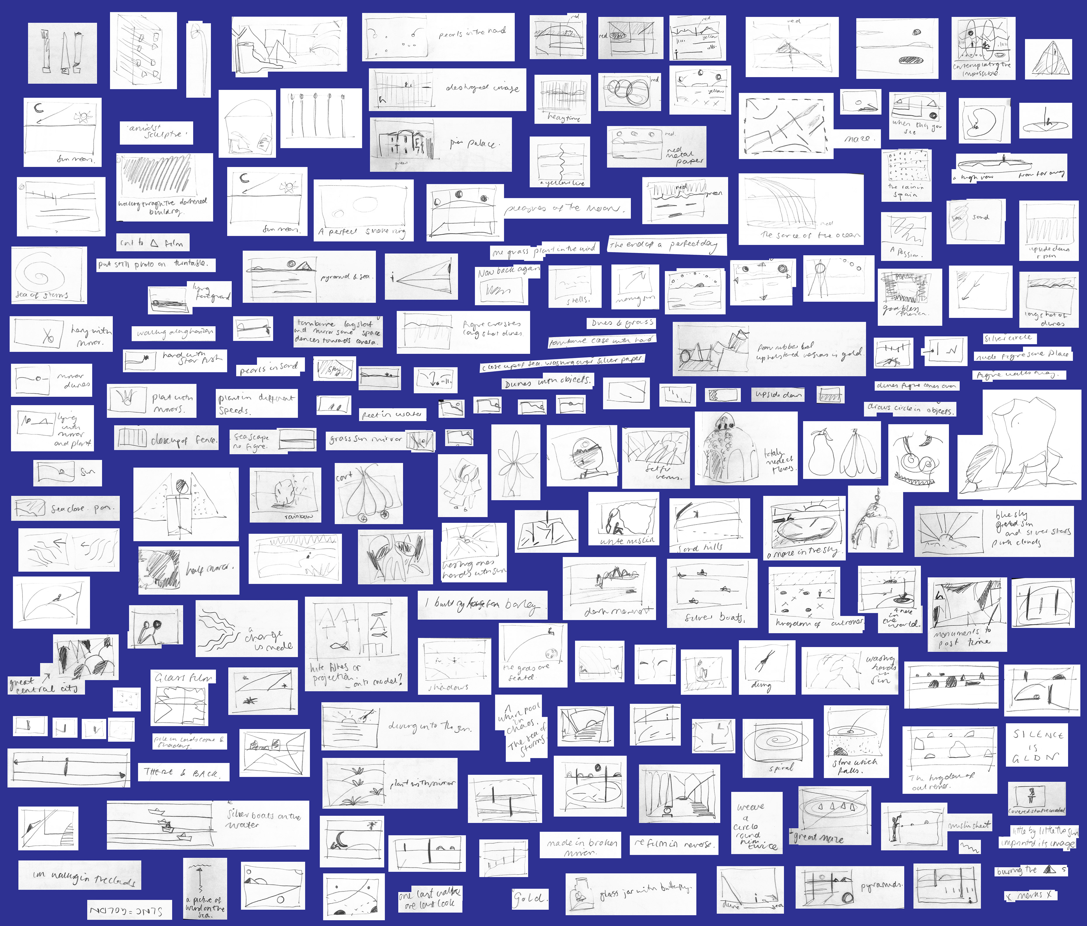 After visiting collections at the Tate, BFI, V&A and the Bill Douglas Cinema Museum, I encountered 29 boxes of items from Derek Jarman’s fragmented and mysterious archival world- including 12 sketchbooks, 56 poems, 438 Super 8 film stills, 5 unrealised film scripts, 212 sketches, 92 stage designs and 53 letters. Each iteration of the project responds to this collection of archival material, forming a reinterpreted narrative that references the poetic nature of the content and their creator.